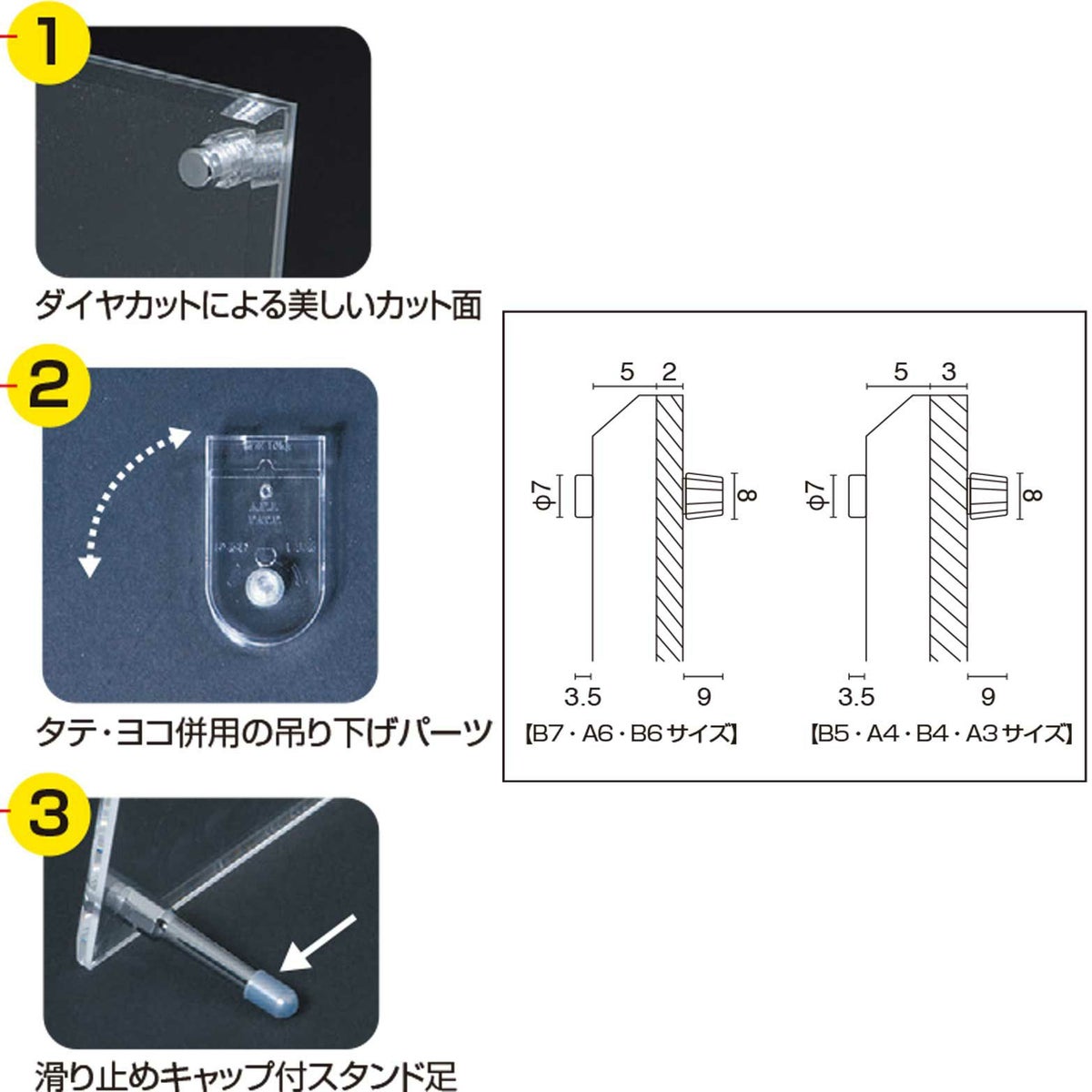 長方形にカットしたアクリル板の小口(カットした断面)に、磨き加工とテーパー加工、穴あけ加工を施すことで、思い出の写真やお気に入りの絵を飾るフォトスタンドを作ることができます。