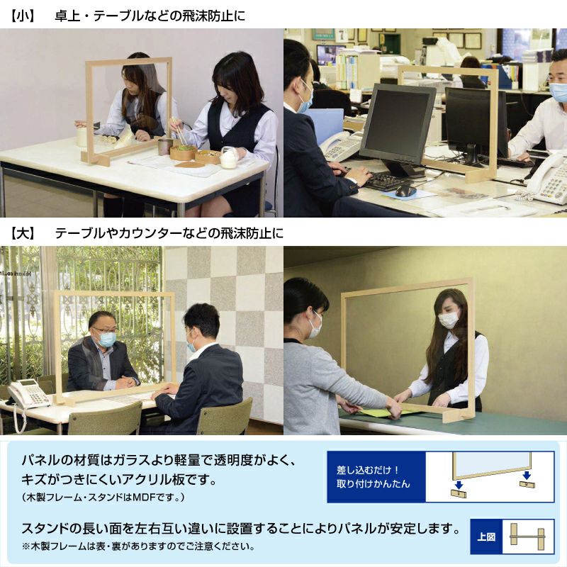 書類の受け渡しや金銭授受に便利な「開口有りタイプ」は、レジや受付・窓口などに最適です♪「木製飛沫防止パーテーション」は、木製フレームなので丈夫で割れにくく、フレームが目印となるので当たったり転倒防止につながります。アクリルデポオリジナル「折り畳み式パーテーション透明」はオフィスやランチの時など必要な時に必要な場所に持ち運びができるサイズです!簡単に設置ができるので、どなたでもお気軽にご利用いただけます♫