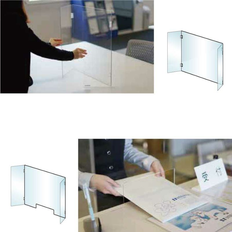 簡単にたためて持ち運びにも便利なコの字パーテーションです。必要な時に必要な場所でお使いいただけます。サイズは2サイズで、それぞれ開口有タイプと無しタイプがございます。開口はA4サイズまで通る大きさで、受付窓口などにも最適です。